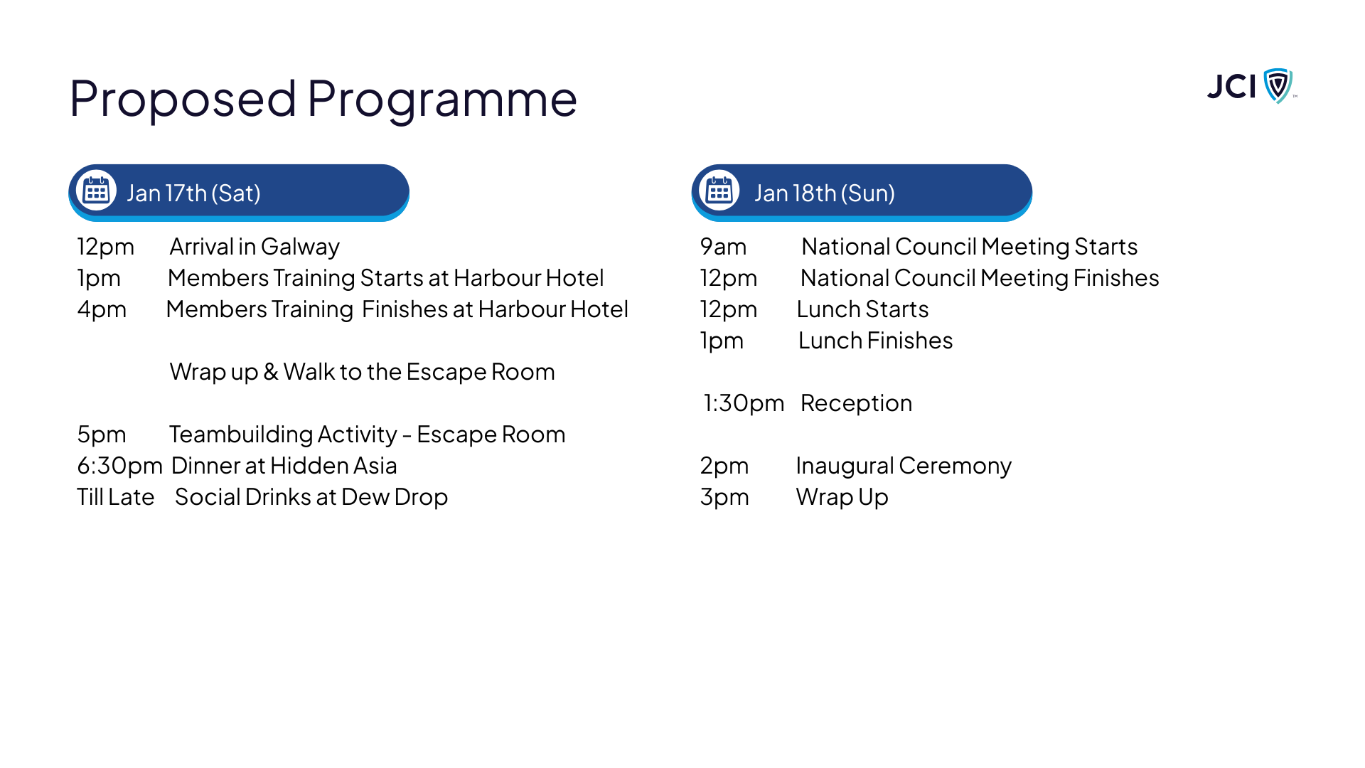 Join us in the heart of Galway for the 2026 JCI Ireland First National Meeting & Inauguration Ceremony. Under the event theme "Leadership For Growth," we officially welcome incoming National President Dean and the 2026 National Board to their new roles.